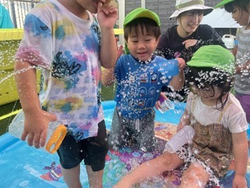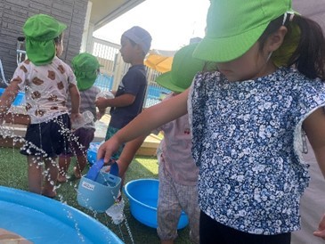 最初は水がなかなか出てこなくて「出てこないね」「あれー?水は?」と見つめていましたが、水が出てくるととても嬉しそうな子どもたちでした。水をすくっては保育者にかけることを繰り返し行ったり、ジュース屋さんをしたりとそれぞれ遊びを楽しんでいました。水遊びでの約束もしっかりと守っています。