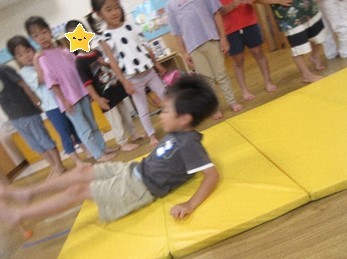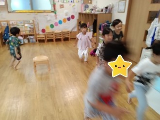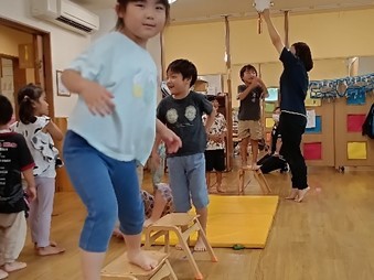 椅子の上に乗ってジャンプしたり跨いだりと、いつもできないことに挑戦して新鮮な気持ちの子どもたち。「今日は特別の日だよね」と言って嬉しそうに椅子に乗ってタンバリンやボールキャッチをしながらダイナミックにジャンプしていました。でんぐり返しをしたり飛行機になって走ったりなどたくさん体を動かして汗だくになっていました。