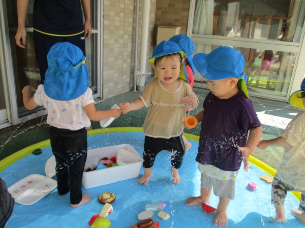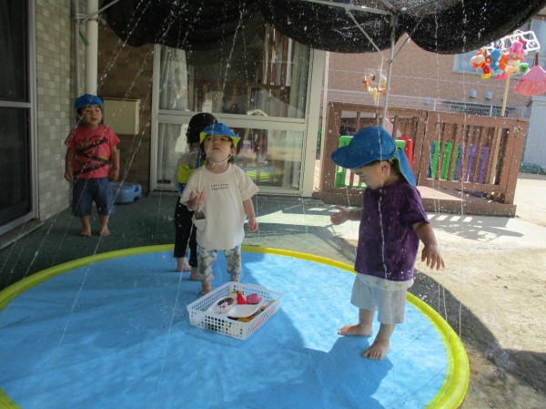 こどもの家・志木中宗岡 あひる組(1歳児)シャワーマットで水遊び!!