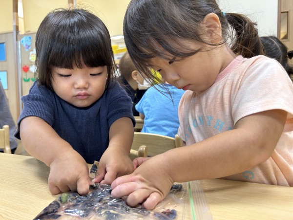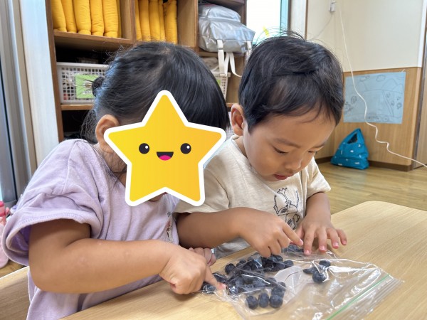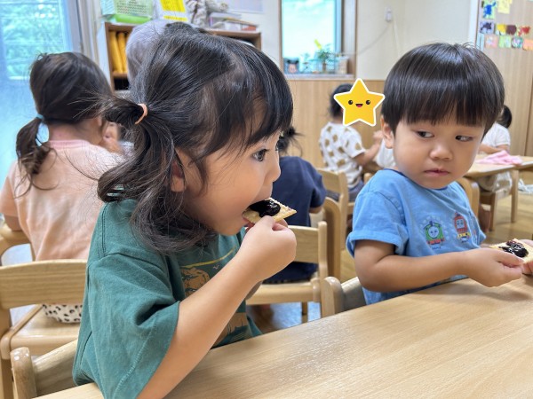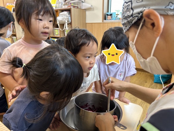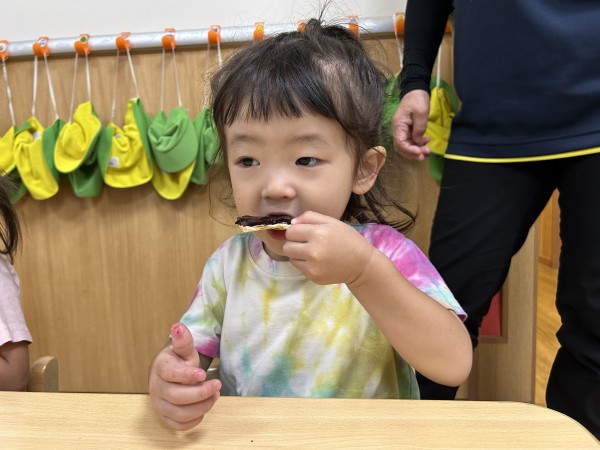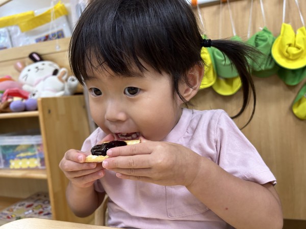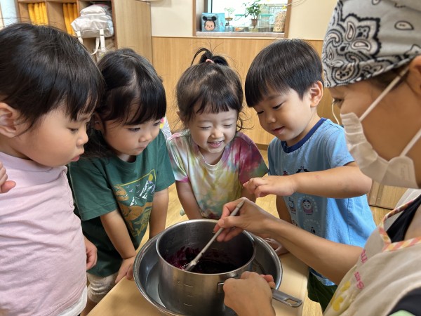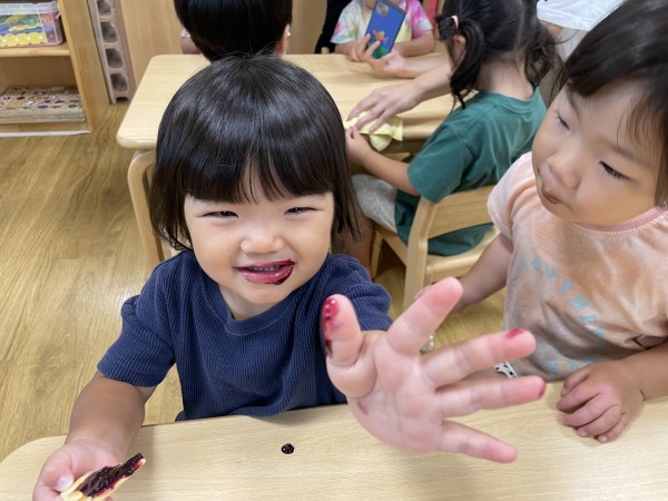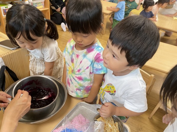 ブルーベリーを手で潰す工程では、子どもたちから「なにかみどりがでてきた!」「ちょっとかたいね」「たのしくなってきた」など様々な声が聞かれました。潰したブルーベリーを砂糖と一緒に溶かす工程を見守り、鍋の中の様子を見ると「ドロドロしてる」「むらさきになった!」などブルーベリーの変化を感じていました。完成に近づいてくると、子どもたちからおいしくなーれコールが始まりました。クラッカーに出来立てのジャムをつけて試食しましたが、「あまい」「サクサクしておいしい」「もっとたべたい」と会話が弾み、あっという間に全員完食しました。