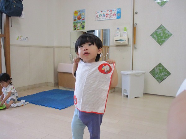 ハンカチを沢山用意すると、好きなハンカチを選んで「つーけーてー」と言う子や、自分で頭に乗せて「みてー」と言う子も♡