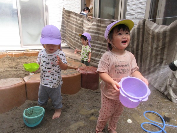 今回は1歳児りす組・2歳児うさぎ組の水遊びの様子をお伝え致します。