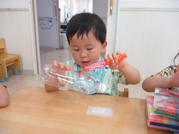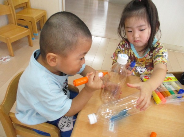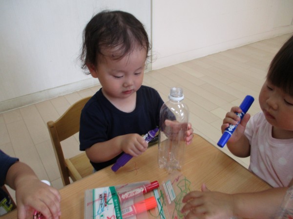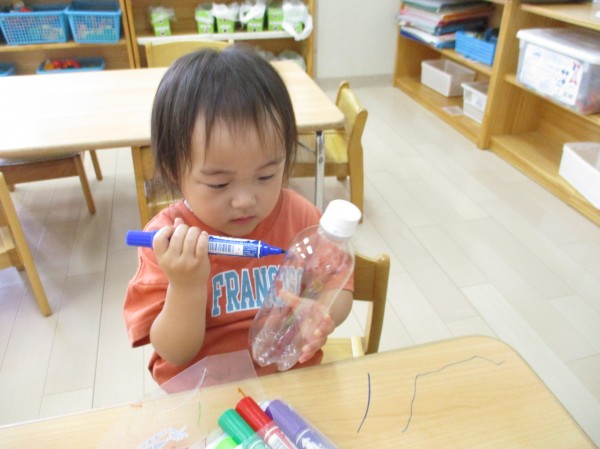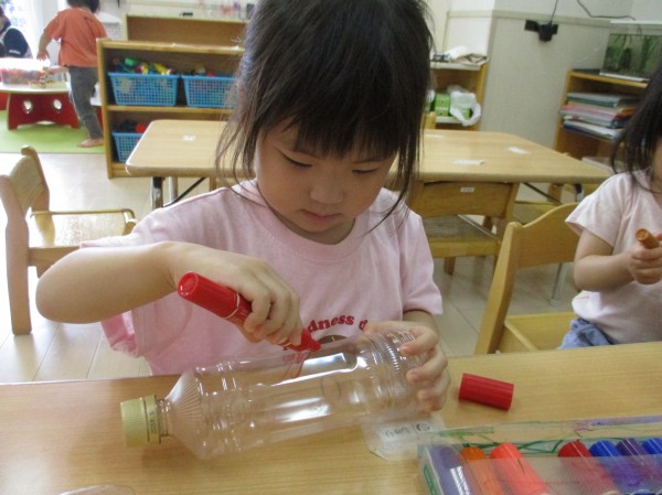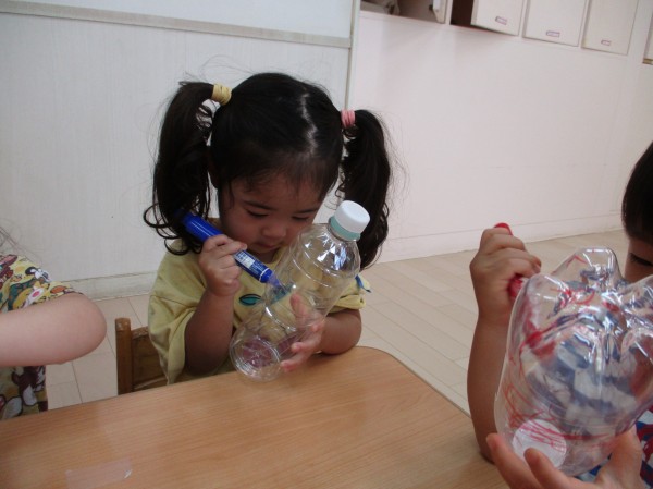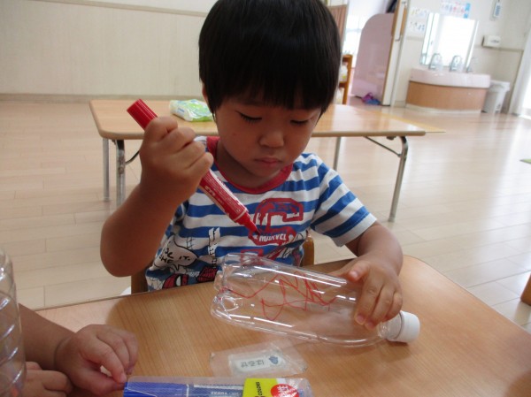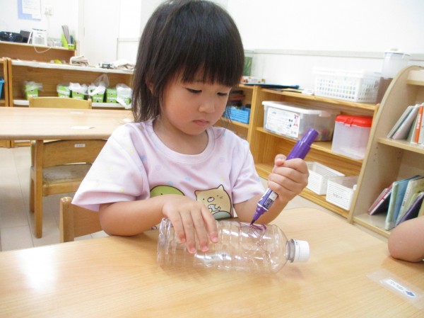 ペットボトルに、ペンで自由にお絵描きをしました。