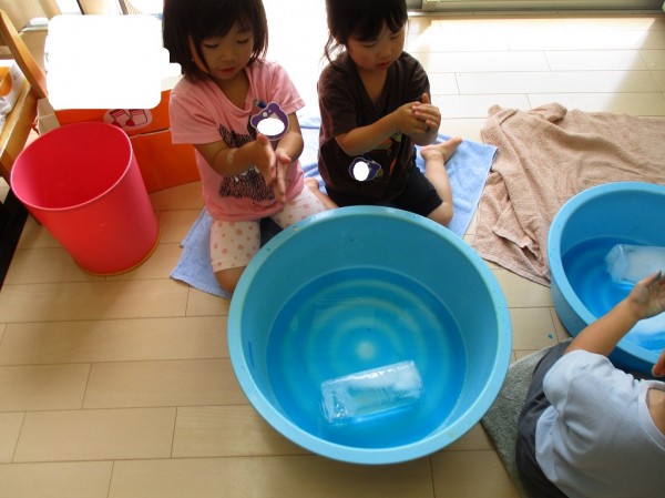 大きな氷を作りタライに広げると、「なになに!?氷だ!」「触っていい?」と早く遊びたい様子を見せる子どもたち。