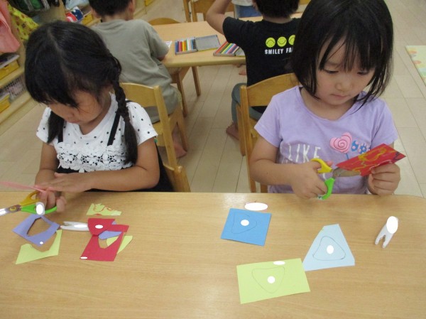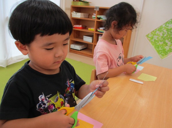 線に沿ってハサミでちょっぴり緊張しながら切っていく子どもたち。