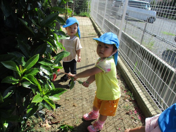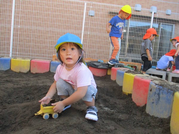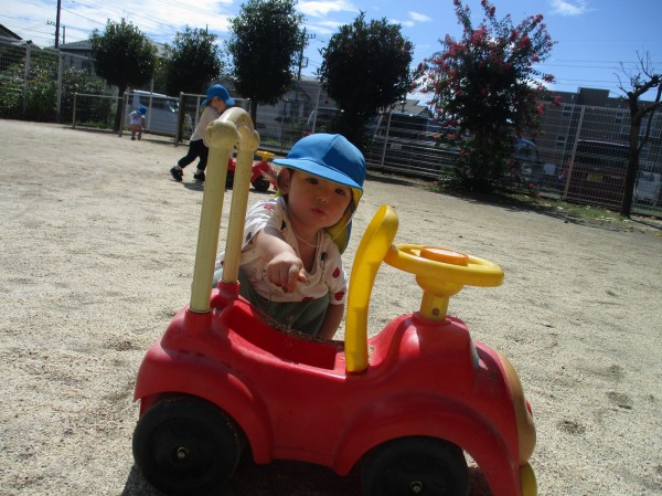 この頃、水遊びや室内遊びの日が多かったので、久しぶりの園庭で子ども達も大興奮!!靴を履いたら、嬉しそうに歩きだす子や、砂場やコンビカー等の好きな遊びを目掛けて元気いっぱい走っていく子も(^▽^)