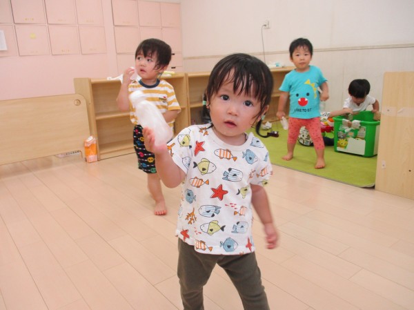 お部屋では、ひんやり気持ちいい凍らせたペットボトルで遊びました。