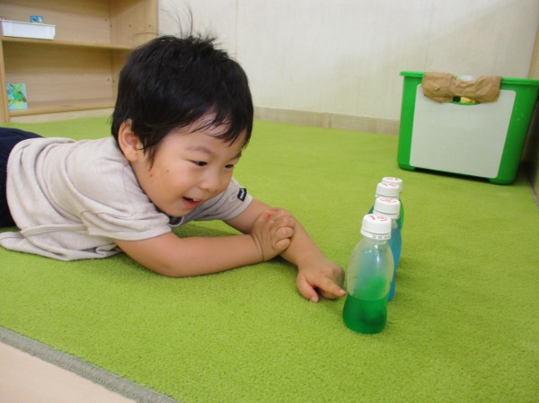 手で握ったり頬に当てて冷たさを楽しむ子や、振るとシャカシャカ音が鳴るのを楽しむ子、好きな色を綺麗に並べて嬉しそうに眺めている子や、ジュース屋さんみたいに並べてお友達と一緒にごっこ遊びをしている子など、みんなそれぞれの楽しみ方で微笑ましい一面を見ることが出来ました♡