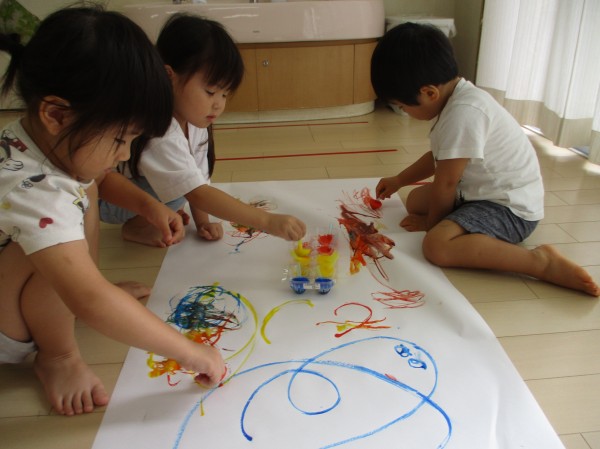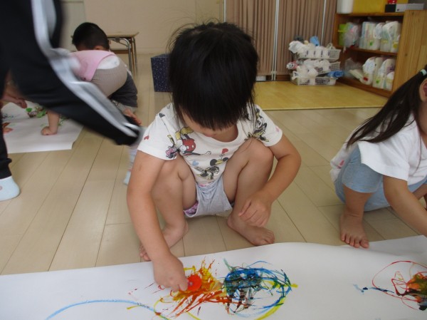 色が混ざるのも発見し、「つぎはー、これ!」と違う色を選んだり、