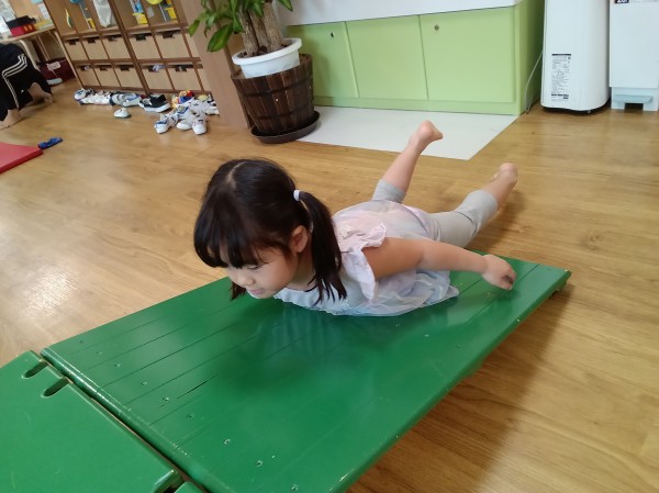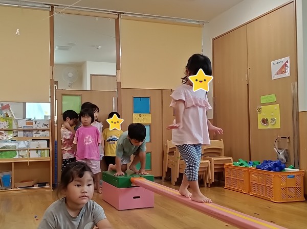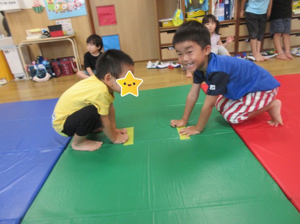 運動遊びでは体操をしてからお相撲や尻相撲、平均台をして遊びました。お相撲や尻相撲では「はっけよい、のこった」の掛け声と同時にお友だちを押して勝負をし、とても大盛り上がりでした。はっけよいのポーズが様になっていて可愛らしかったです。平均台では登ったり下りたりを何回も繰り返したりじゃんけんゲームをしたりなど様々な遊び方で体を動かしました。