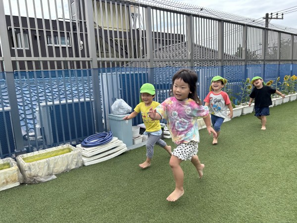 今日は、屋上へ行き運動遊びをしてから水遊びをしました。