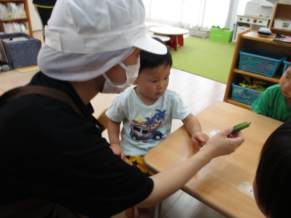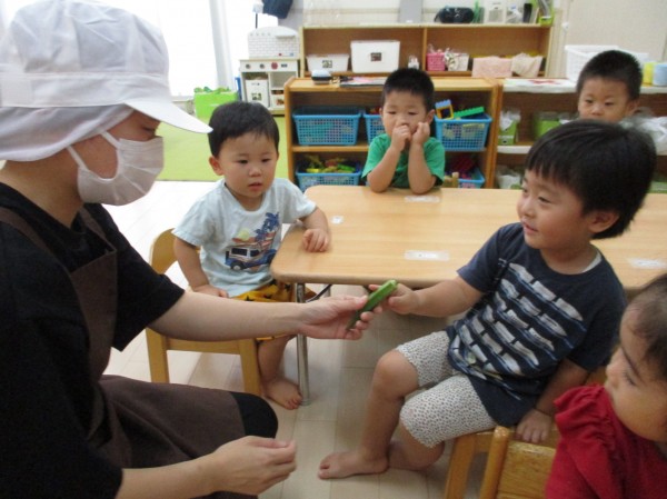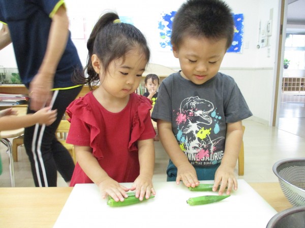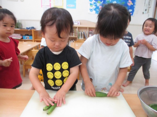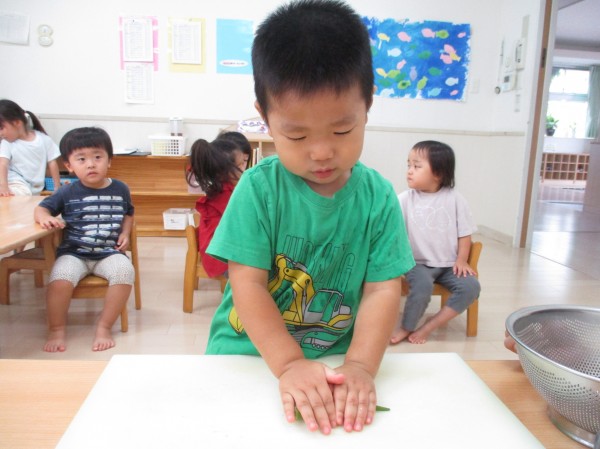 こどもの家・志木中宗岡 らっこ組(2歳児クラス)オクラの板摺り!
