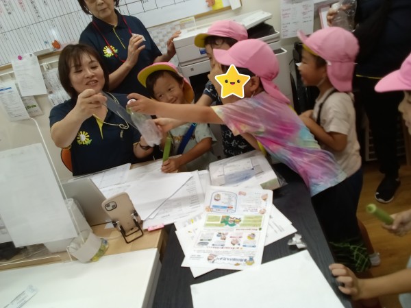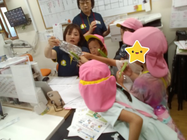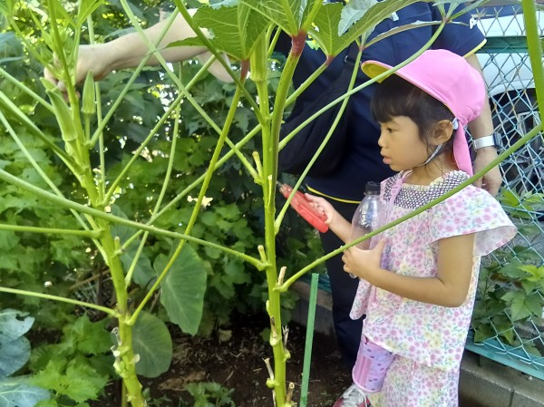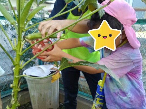 今日は畑の水やりをしに行きました。水をあげていると大きくなっているオクラやピーマンを発見…!「これ収穫できるんじゃない?」と子どもたちから気づいて収穫することになりました。「ぼくはこのオクラにする!」と言ってハサミで力を入れて上手に切ることが出来収穫を喜んでいました。一人一個お家にお持ち帰りしていいということを伝えると「やったー」と大喜びで、帰ってきて大事そうに袋に入れてリュックにしまっていた子どもたちです。帰ってきて事務所の先生達に得意げに見せていた子どもたちが可愛らしかったです。ペットボトルと大きさを比べっこしながら終始ニコニコでした。