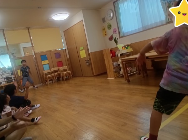 お部屋でドッチボールをして遊びました。子どもたちでチーム分けをしながら「○○くん狙おうかな」「次は僕にボール回してね」と同じチーム同士で作戦を練り、仲良く楽しんでいました。たくさん水分補給を取りながらお部屋での時間を楽しみました。その後は水遊びをして過ごしています。