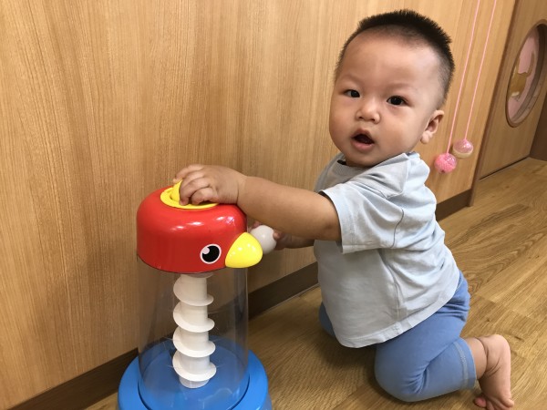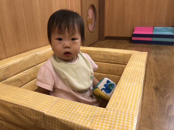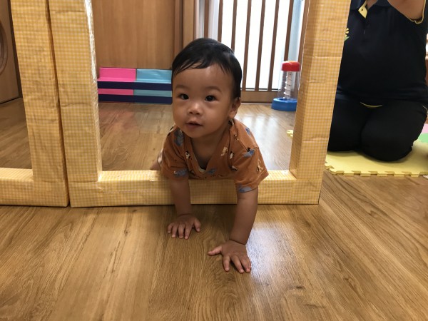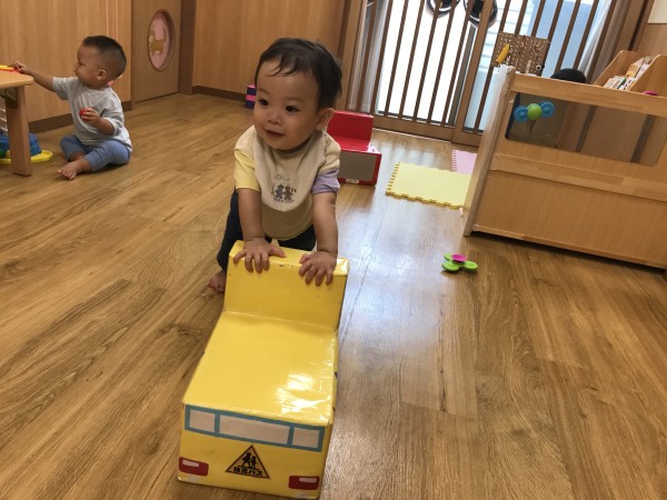 今日は、お部屋で過ごしました。手作りの手押し車やトンネル、一本橋でそれぞれ遊ぶ子どもたち。トンネルに潜ったり、重ねたトンネルを跨いで中に入ってゆっくりとする姿が見られました。手押し車では、体幹がしっかりしてきたことや、足腰に力が入るようになったことで、バランスを取りながら手で押して進めるようになってきています。絵本を見たり、音楽が流れると嬉しそうにする子どもたちの姿が微笑ましかったです。遊びが広がる中で、「このおもちゃを使っていたい」、「欲しい」という主張が出来るようになってきました。子どもたちの思いを受け止めながら別のおもちゃに誘ったり、順番があることを知らせてもらいながらお友だちの関わり方を徐々に知ってもらえるように関わっています。お部屋で過ごした後は、縁側でミストを浴びながらシャボン玉を見たり水遊び用のおもちゃで遊びながら過ごしました。