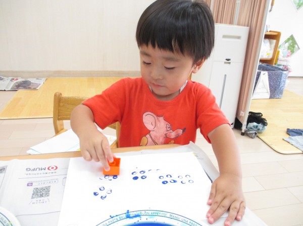 2歳児クラスでは、トイレットペーパーの芯とブロックを使って、スタンプをしました。