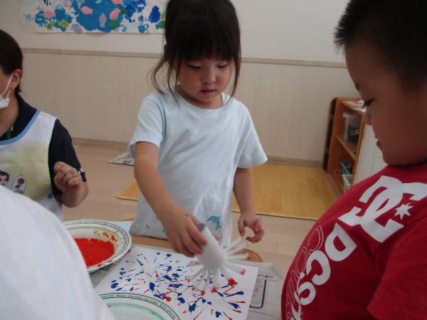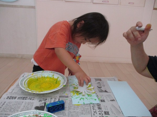 トイレットペーパーの芯の先を放射線状に切ったものでスタンプをすると、綺麗な模様が表れて