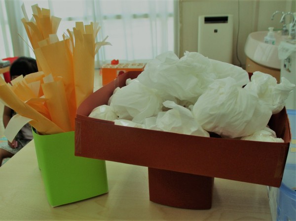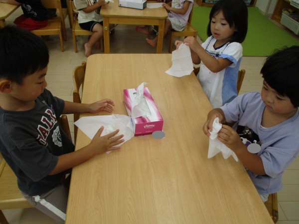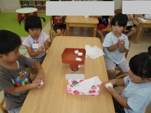 ティッシュをくるくる丸めてお団子を作りました。