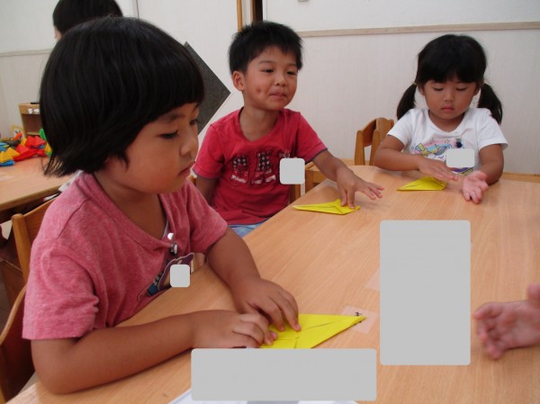 きつねは折り紙で保育者と一緒に折りました。途中、折り方が難しくなると友達が教えてくれる微笑ましい様子も見られました。
