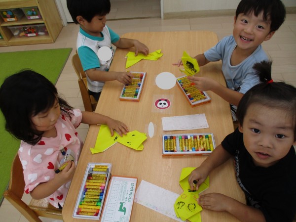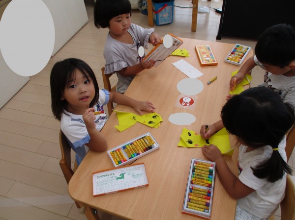 クレヨンできつねの目や口、おひげなど‥見本を見ながら上手に描いていました。
