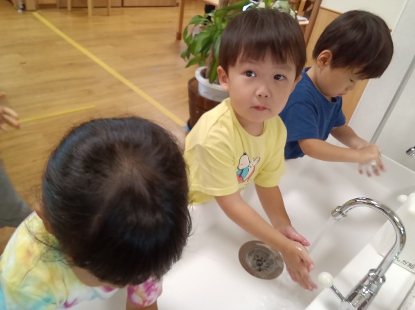 最初の1回目の手洗いでは全員が、洗っていないのと同じくらいチェッカーローションが残っていました。それから、実際に自分の目で洗い残しをチェックして、看護師と一緒に、自分の洗い残しの部分を洗うための手洗いの手順を確認しました。数回繰り返して、ほとんどローションの残りが光らなくなってOKが出ると、笑顔でお友だちに自慢している姿がありました。