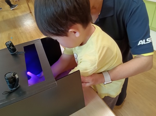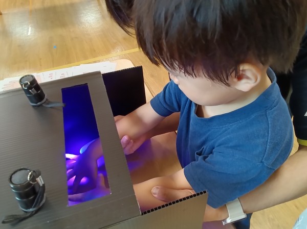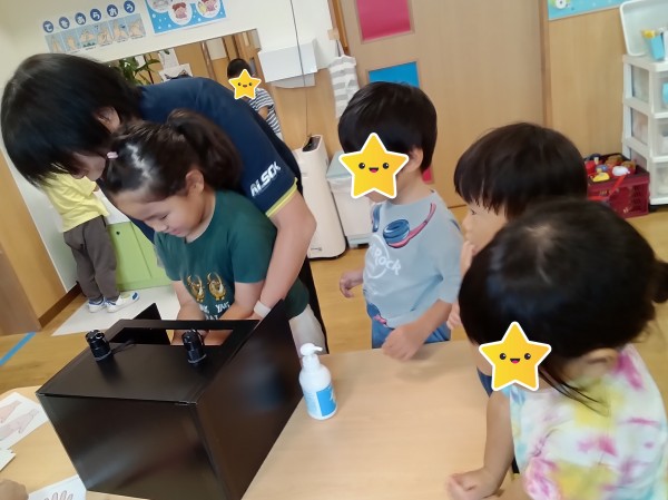 先日3歳児で実施した手洗いチェッカーを使用した手洗い指導を、本日は4・5歳児に行いました。