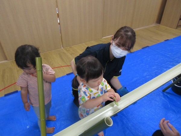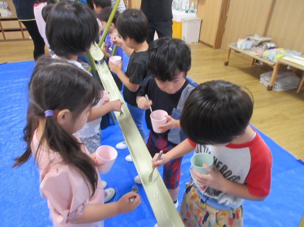8月、昨年度の夏に絵本献立として行った『流しそうめん』が子ども達に好評で「つぎのなつもやりたい!」と、昨年度からリクエストされていたので、夏の恒例行事に出来たらと、今年度も取り入れました。