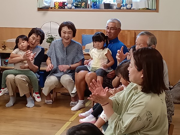 膝取りゲームでは、自分のお祖父ちゃんお祖母ちゃんじゃなくても、みんな笑顔で楽しみました。
