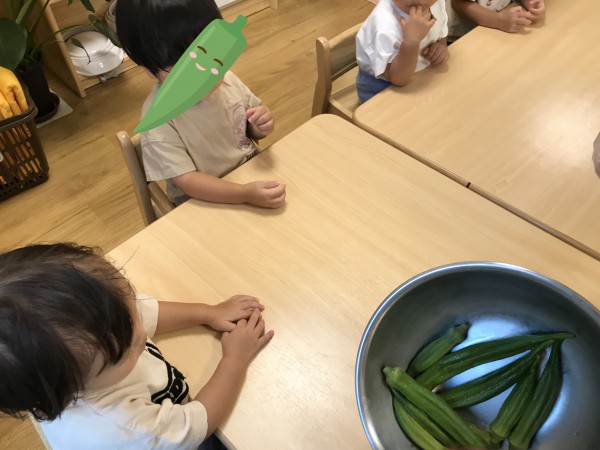 茹でたオクラを醤油とおかかで和えて食べました。美味しかったようで、おかわりを欲しがる子もいました‼