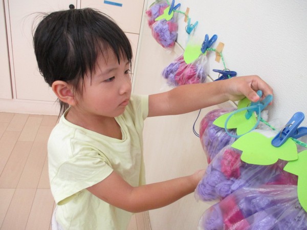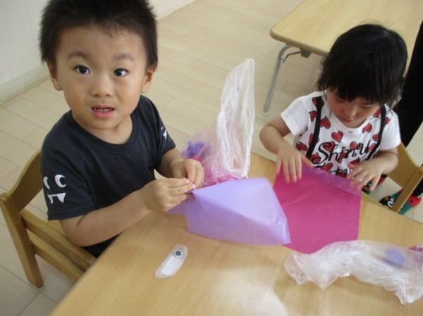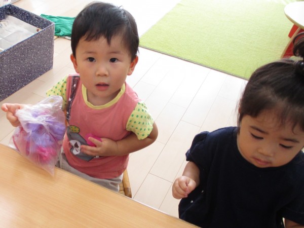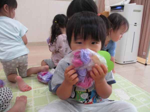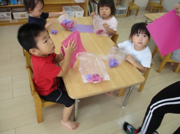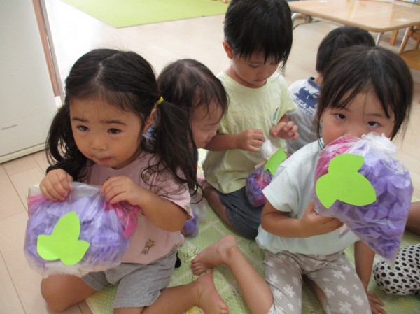 「むらさきがいい!」「くしゃくしゃ~」とお話をしながらお花紙を袋に入れていき、可愛いぶどうを作りました(*^-^*)