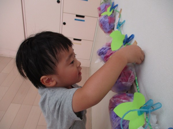 できたぶどうはしばらくお部屋の壁に飾り「○○くんのどれー?」と探したり、お迎えに来たお父さんお母さんや、お部屋に来た他クラスの保育者に「ぶどうつくったの!」と見せてあげたりしていました( *´艸`)