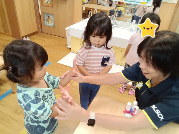屋外活動から帰ってきた時の手洗いは習慣になっています。荷物を片づけるとすぐに洗面所に向かう子どもたちに、今日はスタンプで手洗いチェックを行いました。ほとんどの子が、せっけんをつけてからすぐに水で流してしまおうとします。すぐに水で流した子は、スタンプが落ちません。せっけんをつけてからしっかり泡で洗った後に水で流すように伝えました。