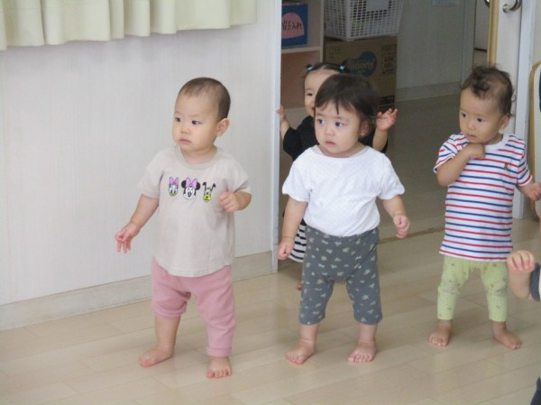丁度体操をしていたところで、その様子にびっくりして固まってしまったたまご組の子どもたち。