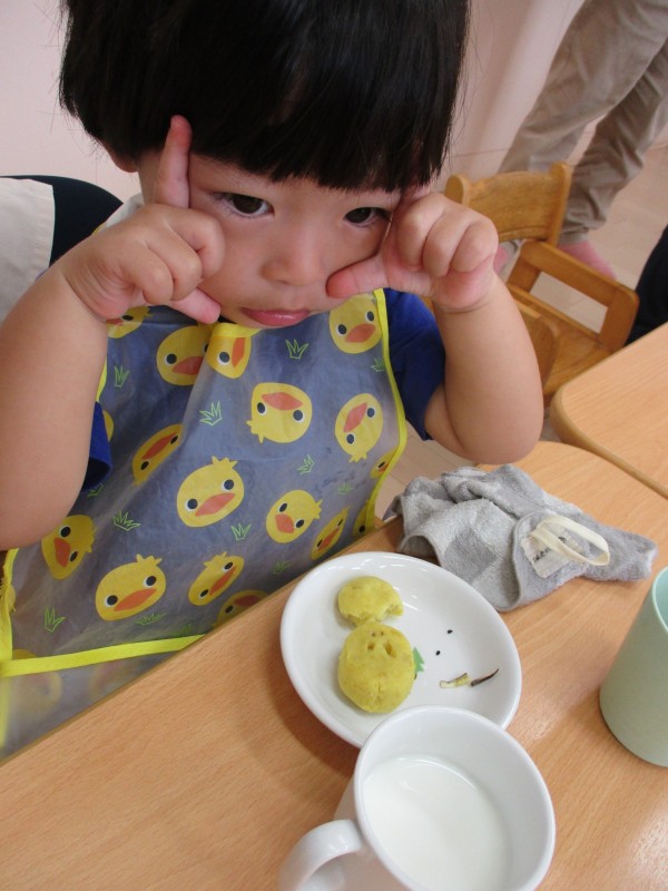 「お芋の味だね」「おいしいね」等と保育者やお友達と会話をしながら、秋の味覚を楽しんでいました(^o^)
