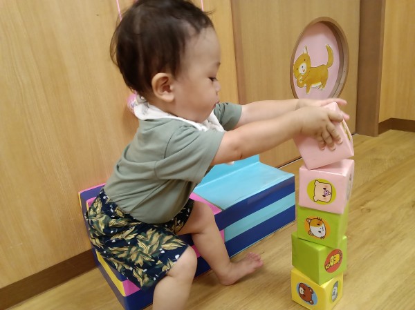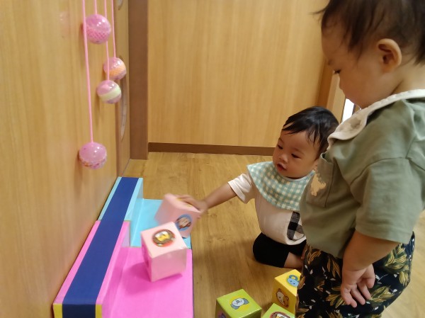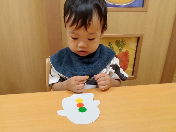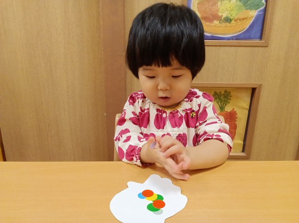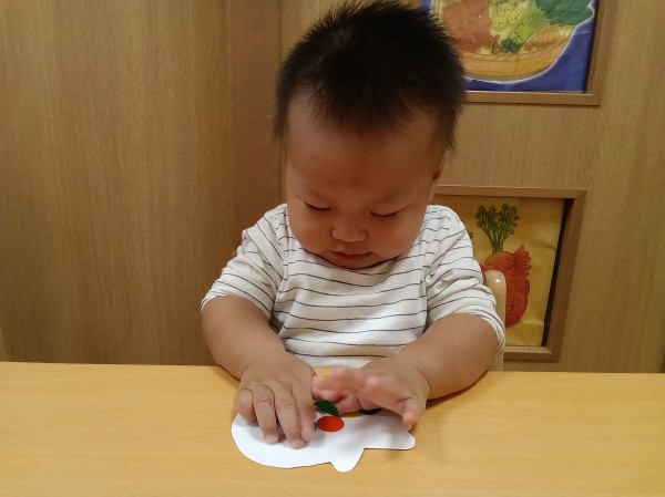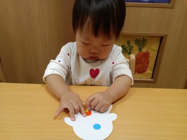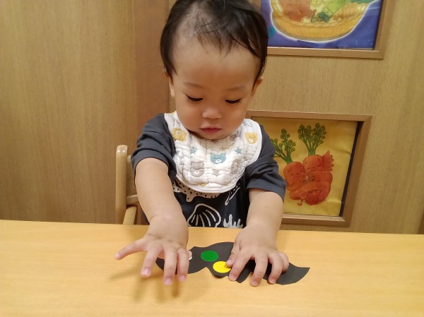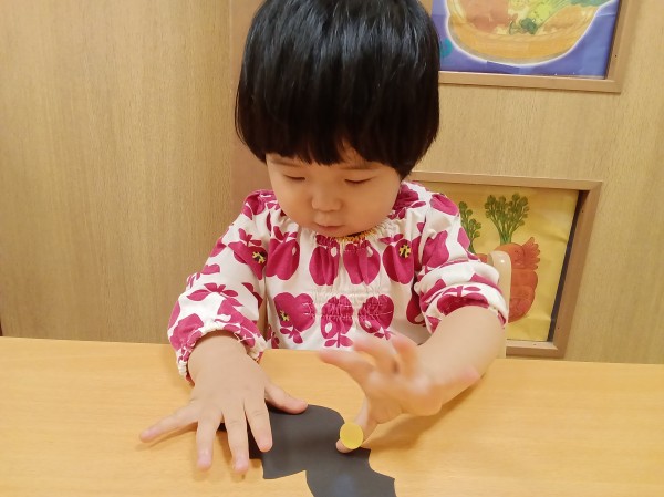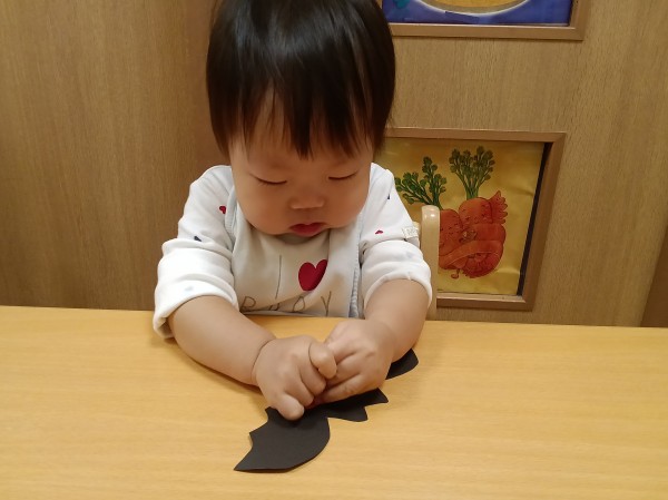 今日は、保育園で始めてシール遊びをしました。今月のハロウィンに向けての制作をした子どもたち。保育者にお手伝いしてもらいながら貼ったり、手にシールがくっつき両手で持ち替えたりしながら一生懸命取り組んでいました。集中しすぎて口からうっかりよだれが出してしまう場面は微笑ましかったです。その後は、マットのトンネルをしたり、絵本を見たり好きなおもちゃで遊びました。また、うさぎ組さんのお部屋に行ってお姉さんたちと一緒に遊んだり、保育園内の探検を楽しみました。