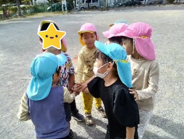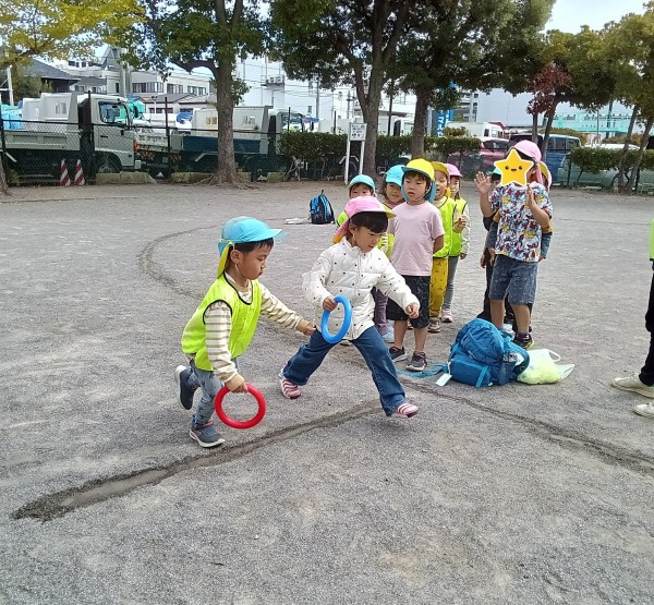 3クラス混合チームで、リレー遊びもしました。すっかりリレーにも慣れてきた子どもたちは、バトンをもらう時に、手をグーンと伸ばして受け取ったり、「こっちこっち!」と手を大きく振って知らせたりと、それぞれの工夫が見られて、とても驚きました。今日の勝敗は・・・なんと同時の引き分けでした。とてもいい勝負で、みんな満足顔で帰ってきました。