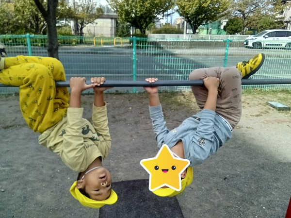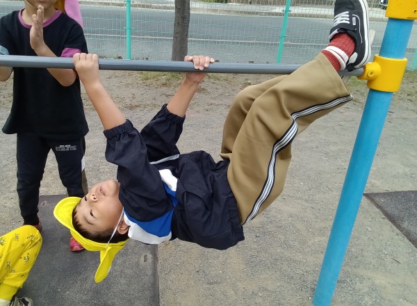 秋晴れの中ぱんだ・きりん・ぞう組の3クラスで、公園に遊びに行きました。公園へ到着すると、「やった!遊ぼう!!」と嬉しそうに方々に走って行った子どもたち。「鬼ごっこする人~?」と言うと「やるやる~!」と言いながら数人が集まってきて“鬼決め”が始まったり、ブランコへ走って行き「せんせ~い、大きくこいで!」と言ったり、鉄棒へ行き、ブタの丸焼きや、コウモリなどの練習をしたり、みんながそれぞれ好きな遊びを楽しみました。