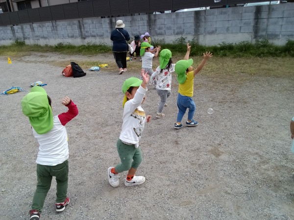 シャボン玉遊びでは、大盛り上がりでシャボン玉を追いかけたり、手でパチンとつぶすのを楽しんでいました。