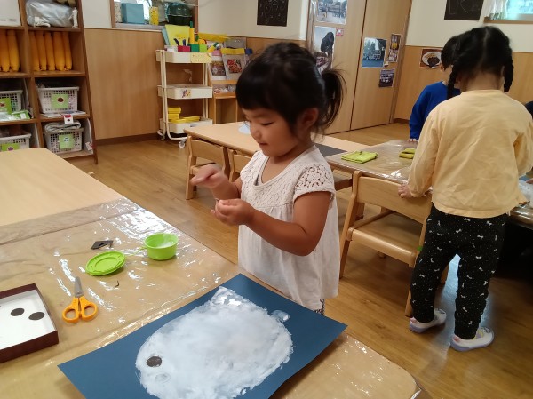 スポンジに絵具をつけて、おはけの型抜きをしました。