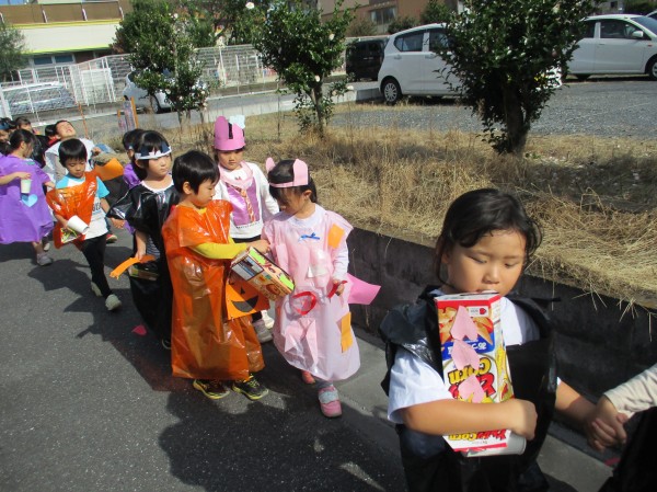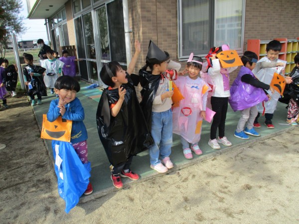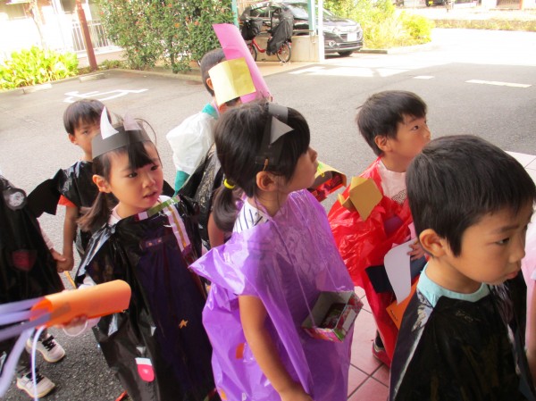 4.5歳の子ども達は、自分達で作った衣装を身にまといお菓子を入れるバックを持って、朝からとっても嬉しそうな様子(*‘∀‘)