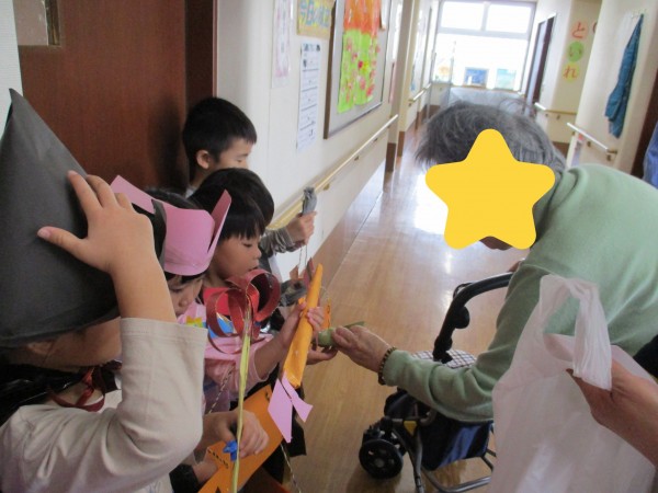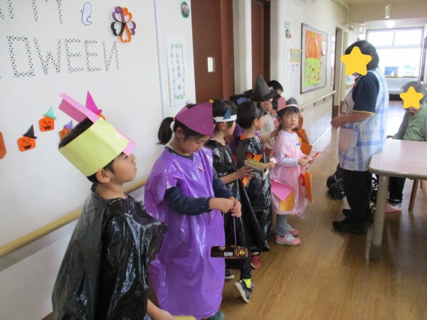 介護施設のたくさんの利用者様にとても緊張した様子の子ども達でしたが、利用者様からお菓子や折り紙で作った可愛い魔女の飾りを頂いたり、お返しに子ども達から♪おばけなんてないさ♫の歌のプレゼントをして、楽しい時間を過ごさせて頂きました。