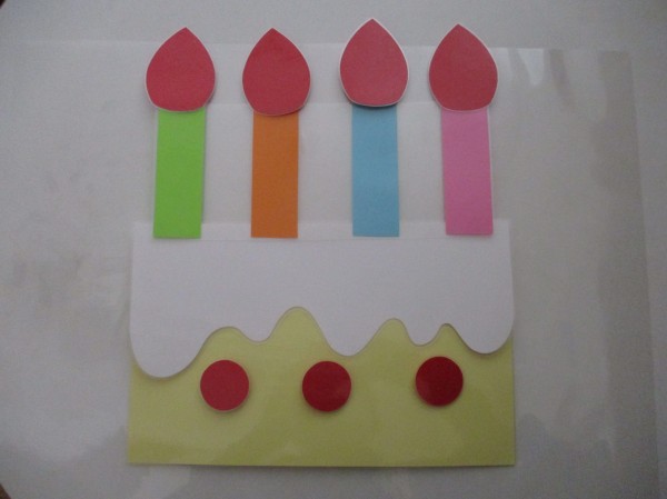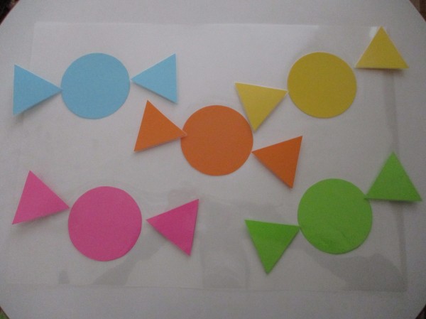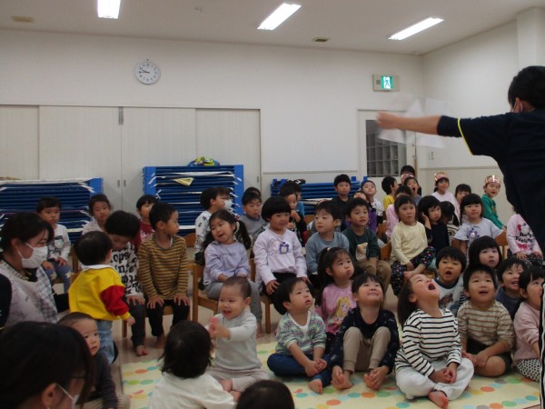 出し物は「ラミネートシアター」。『三角△と四角□でおにぎり』『丸〇と三角△でキャンディー』など色々な形を組み合わせて食べ物を作ると、「いちごだ!」と元気に答えてくれたり、大きなお口をあけたり、モグモグ食べる真似をしていた子どもたちでした( *´艸`)