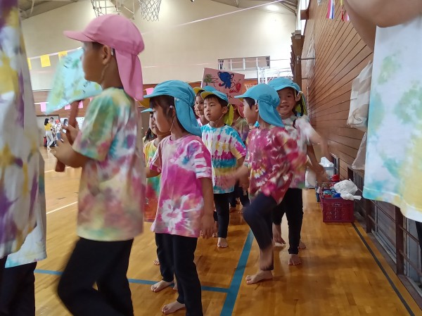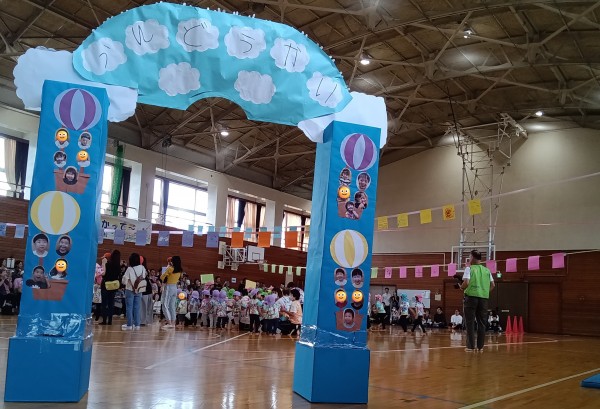 5歳児がプラカードを持ち誘導しながらの入場です。さすがに幼児クラスの子どもたちも緊張していますが、余裕な表情でお友達と楽しそうにお喋りしていました。
