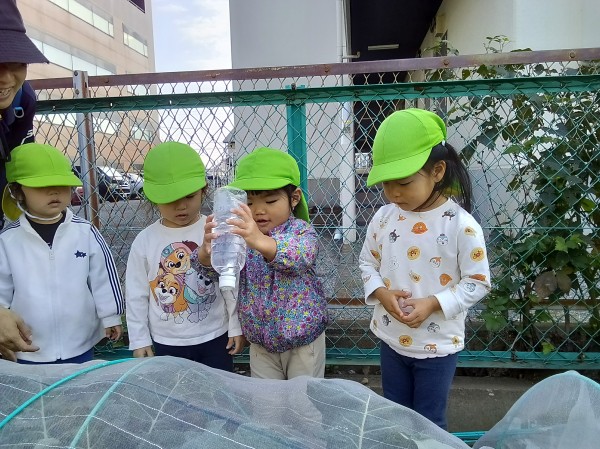 畑ではブロッコリーや大根、白菜が大きくなっていて、「もっと大きくなあれ!」とお願いしながらみんなで水やりをしました。