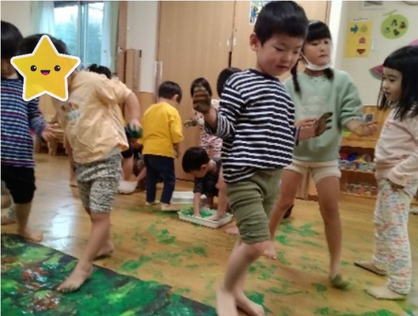 裸足になった子どもたち。そのまま遊びは発展し…模造紙に緑、黄緑、茶色の絵具で色をつけることにしました。初めは手でぺたぺた色付けしていましたが、夢中になるうちに足を使う子も出てきて、模造紙から絵具がはみ出るほどダイナミックな絵具遊びになりました。