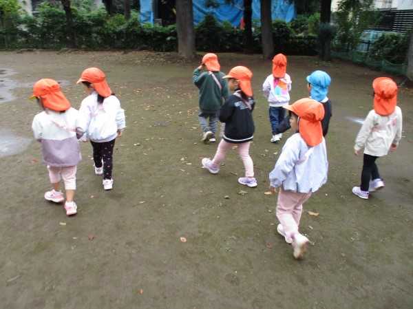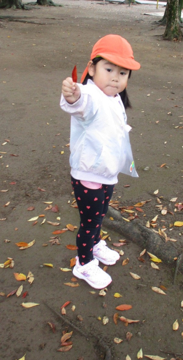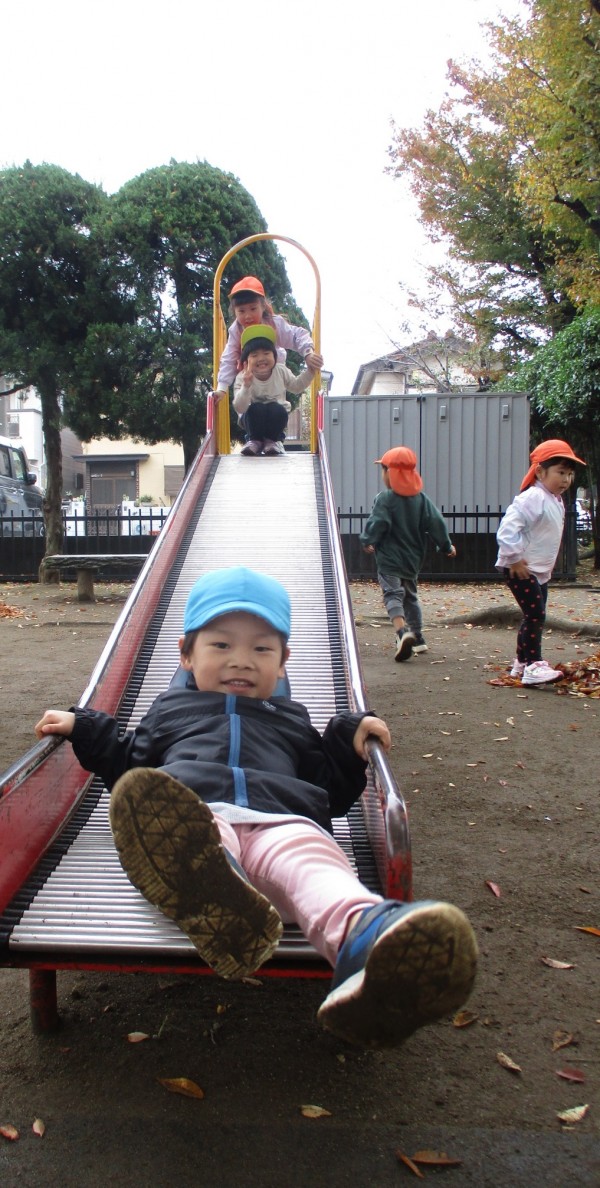 当日は雨上がりでしたが、公園に行き落ち葉を拾ったり、滑り台をしたりして遊びました。