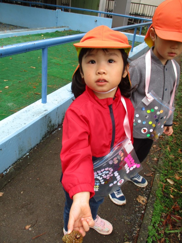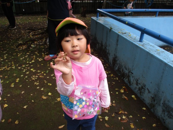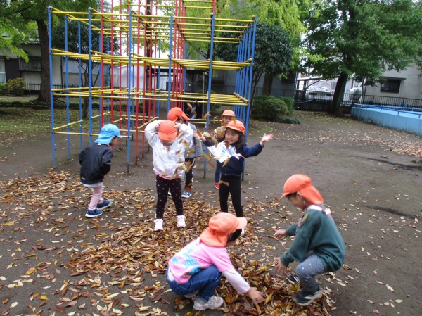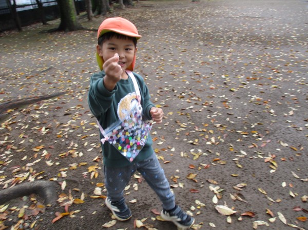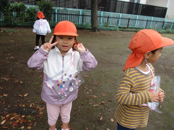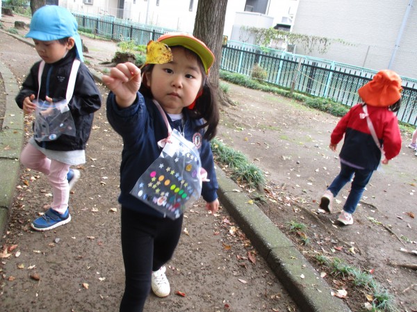 公園に着いて、事前に作った自分のバックに落ち葉や木の実、銀杏などを入れて楽しんでいました。