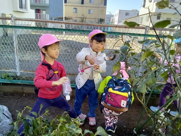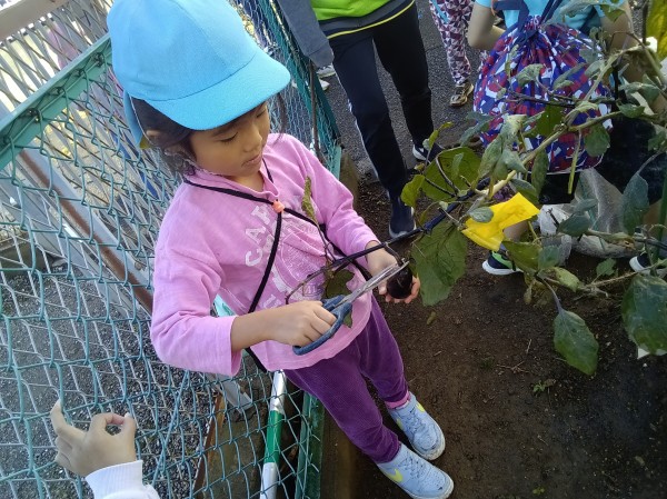 畑に行って水やりをしてから、ピーマンとナスの収穫をしました。
