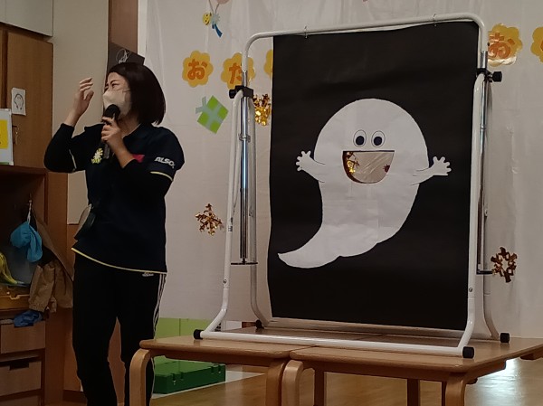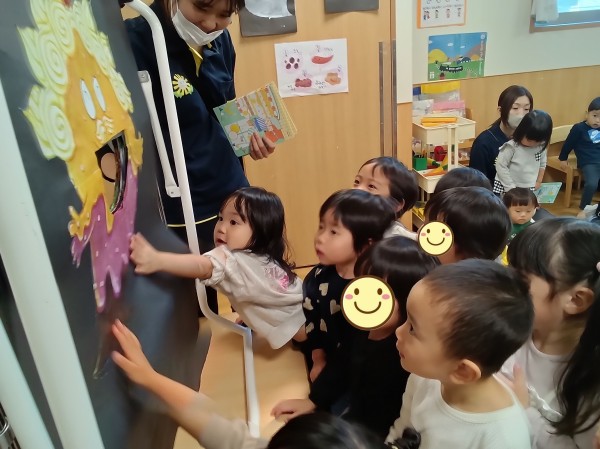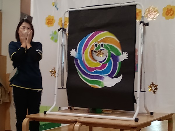 保育者が、誕生日のお祝いに出し物をしました。”おばけのばけたくん”が登場して、色々な食べ物を食べるたびにからだの模様が変化する様子をみて、楽しみました。