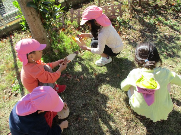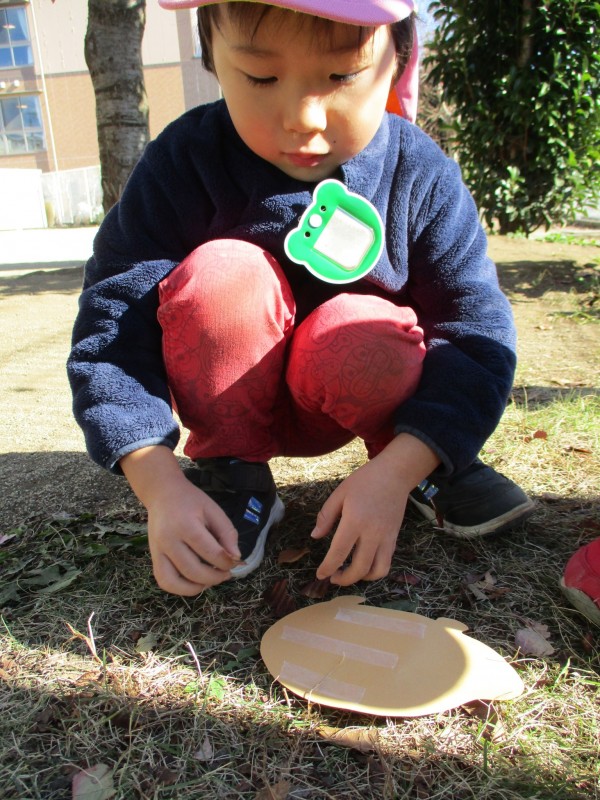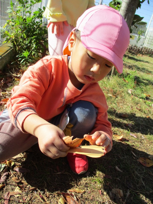 「どの落ち葉にしようかな~」と、園庭にある落ち葉をじっくり見て探す子どもたち。